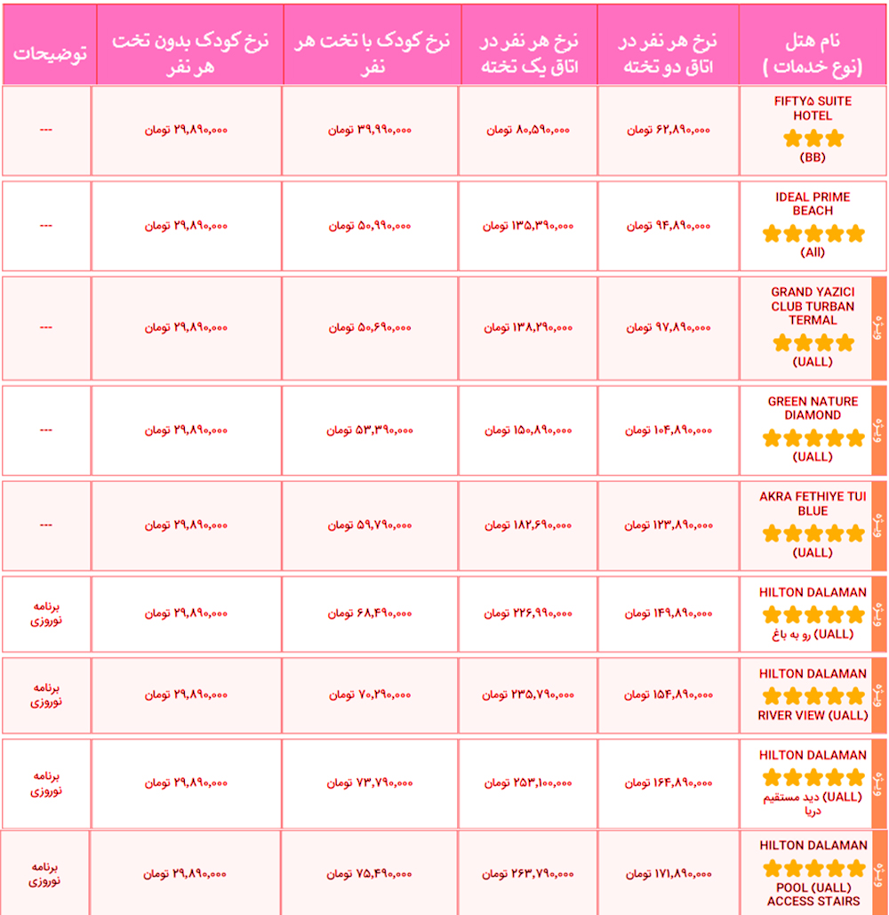 نرخ تور براساس هتل های مختلف 3 و 4 و 5 ستاره در جدول زیر قابل مشاهده است.